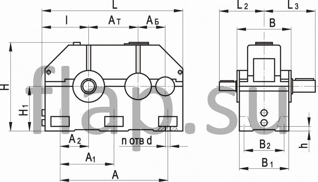 | Типоразмер редуктора | АТ | АБ | L | I | A1 | A2 | L2 | L3 | H | H1 | A | B | B1 | B2 | d | h | n |