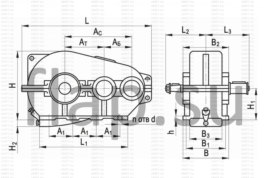 | Типоразмер редуктора | АС | AБ | AТ | А1 | B | B1 | В2 | В3 | H | H1 | H2 | h | L | L1 | L2 | L3 | d | n |